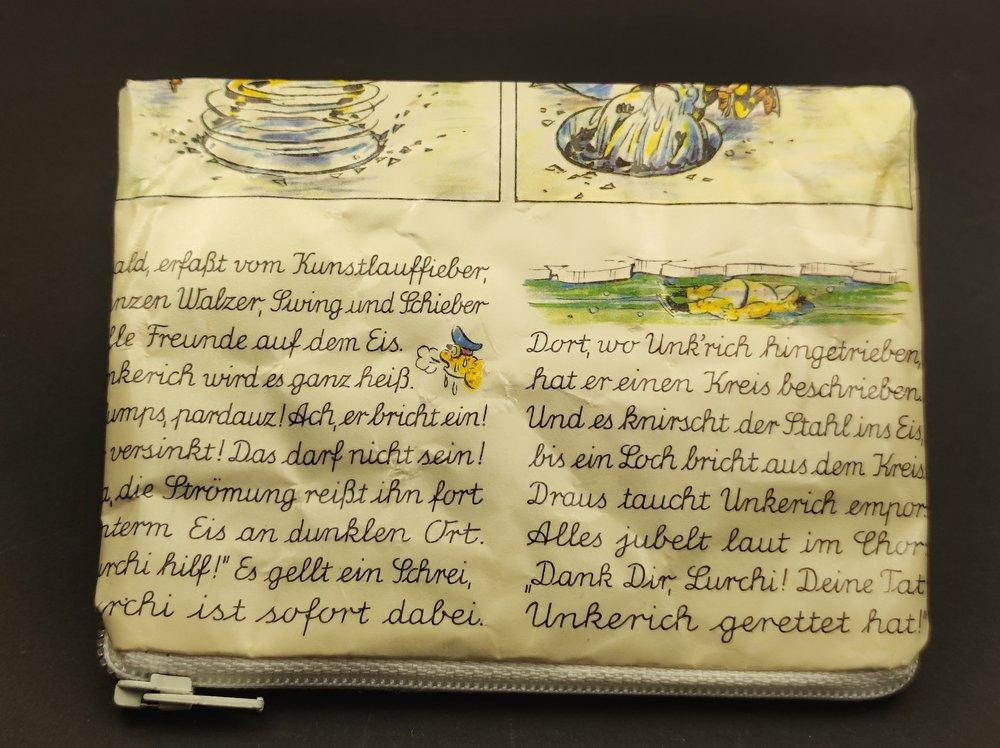 Kleines Täschchen für Scheckkarten, Geld, Kosmetik oder Schätze aller Art. Beidseitig kaschiertes Altpapier. Sehr haltbar. Weisser Reißverschluss. Ca. 10 x 7 cm. Aus alten Original LurchiSalamander ® Heften, die wir aus Altpapiersammlungen oder Flohmarkt-Bücherkisten retten. Von uns in Karlsruhe handgefertigt. Einzelstück.