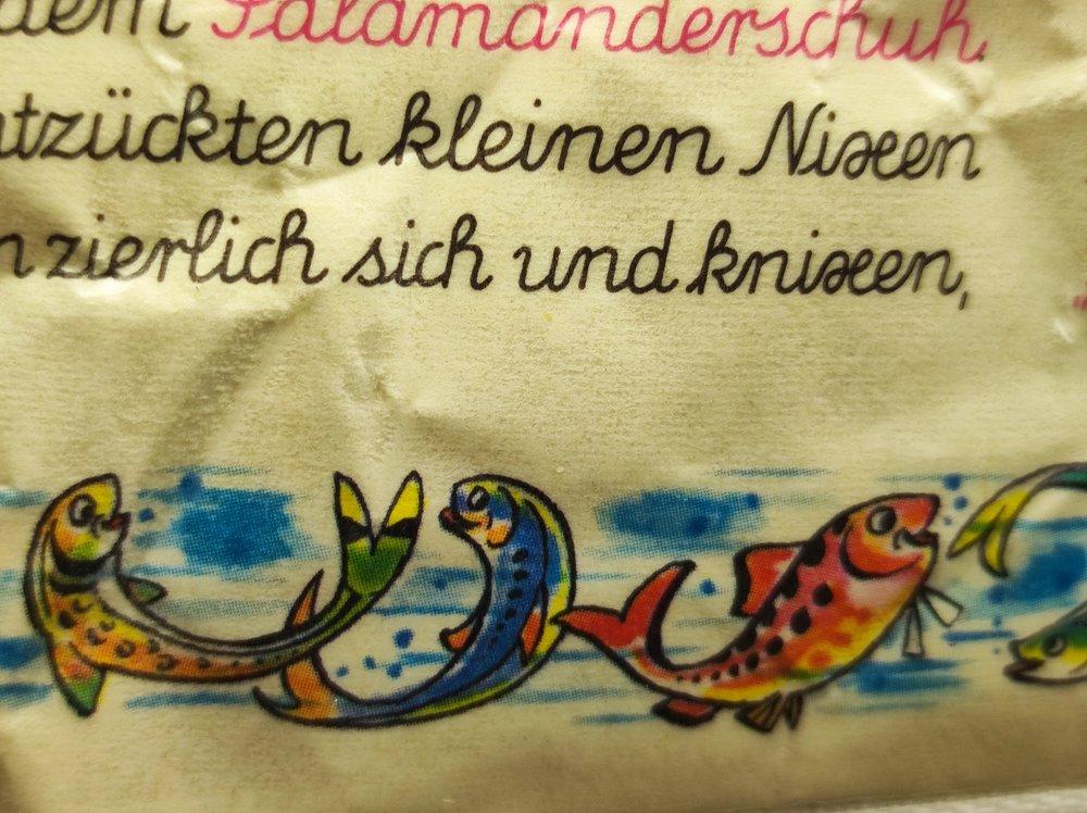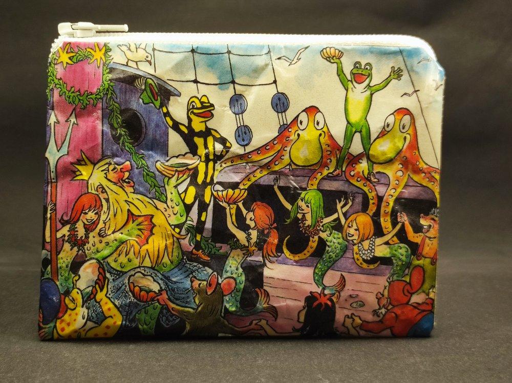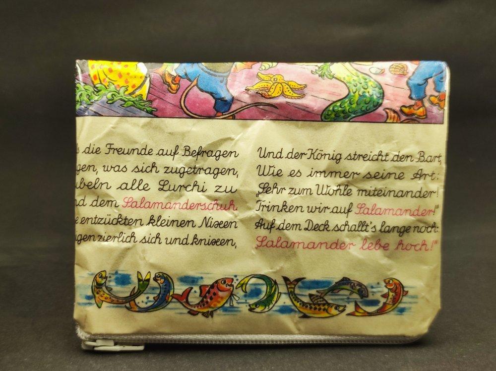 Kleines Täschchen für Scheckkarten, Geld, Kosmetik oder Schätze aller Art. Beidseitig kaschiertes Altpapier. Sehr haltbar. Weisser Reißverschluss. Ca. 10 x 7 cm. Aus alten Original LurchiSalamander ® Heften, die wir aus Altpapiersammlungen oder Flohmarkt-Bücherkisten retten. Von uns in Karlsruhe handgefertigt. Einzelstück.
