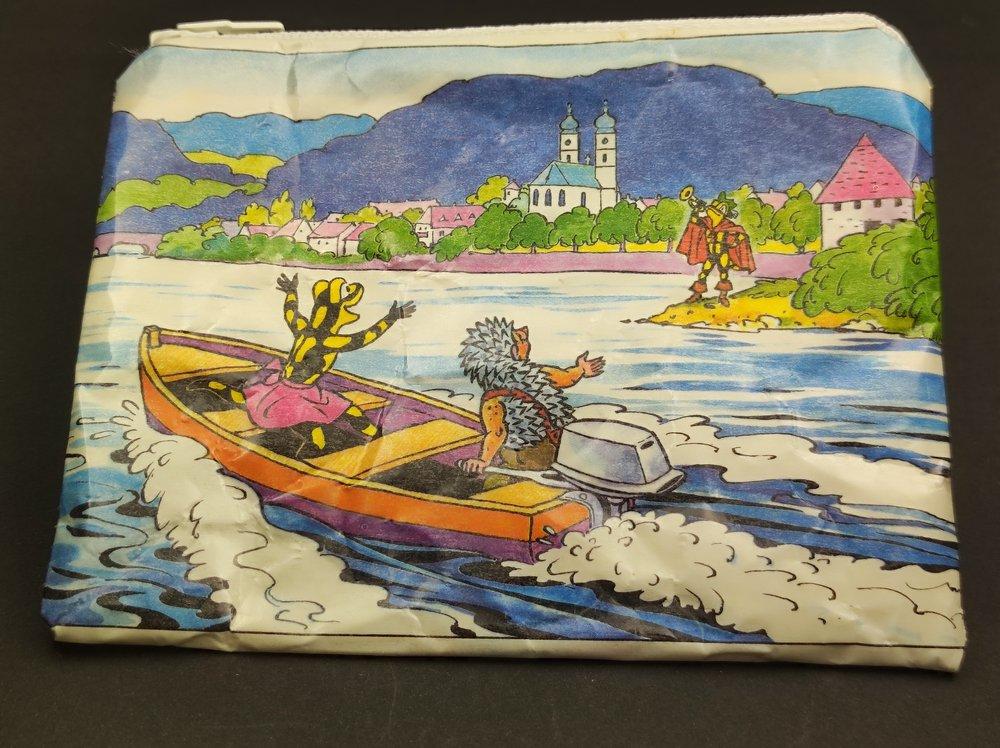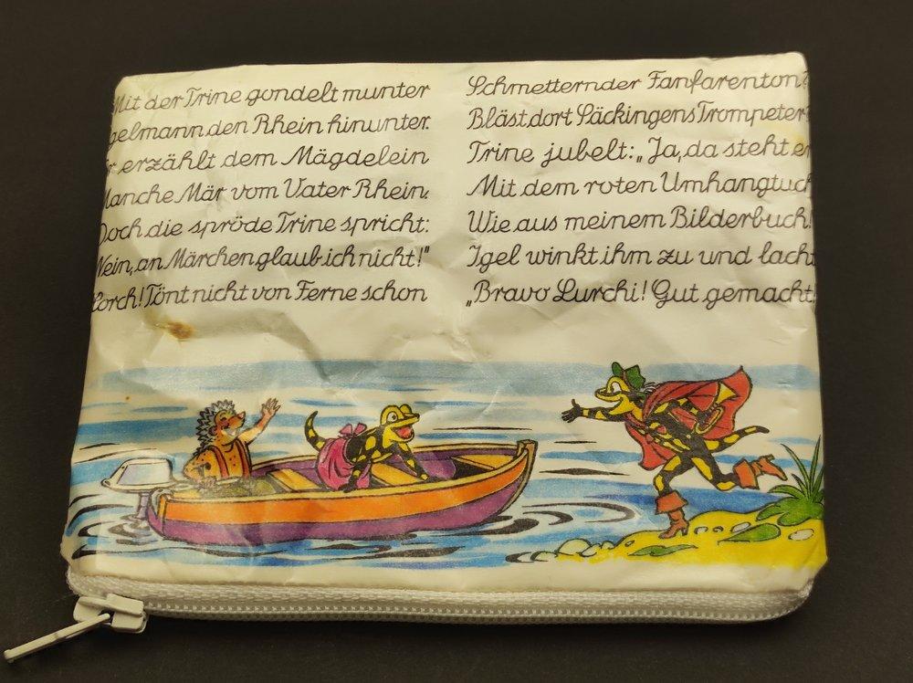 Kleines Täschchen für Scheckkarten, Geld, Kosmetik oder Schätze aller Art. Beidseitig kaschiertes Altpapier. Sehr haltbar. Weisser Reißverschluss. Ca. 10 x 7 cm. Aus alten Original LurchiSalamander ® Heften, die wir aus Altpapiersammlungen oder Flohmarkt-Bücherkisten retten. Von uns in Karlsruhe handgefertigt. Einzelstück.