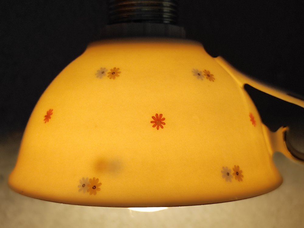 Durchmesser ca. 9 cm, Höhe: ca. 5,5 cm, Transparenz: 5 (Skala von 0 bis 6), Material: Porzellan, Fassung E14.